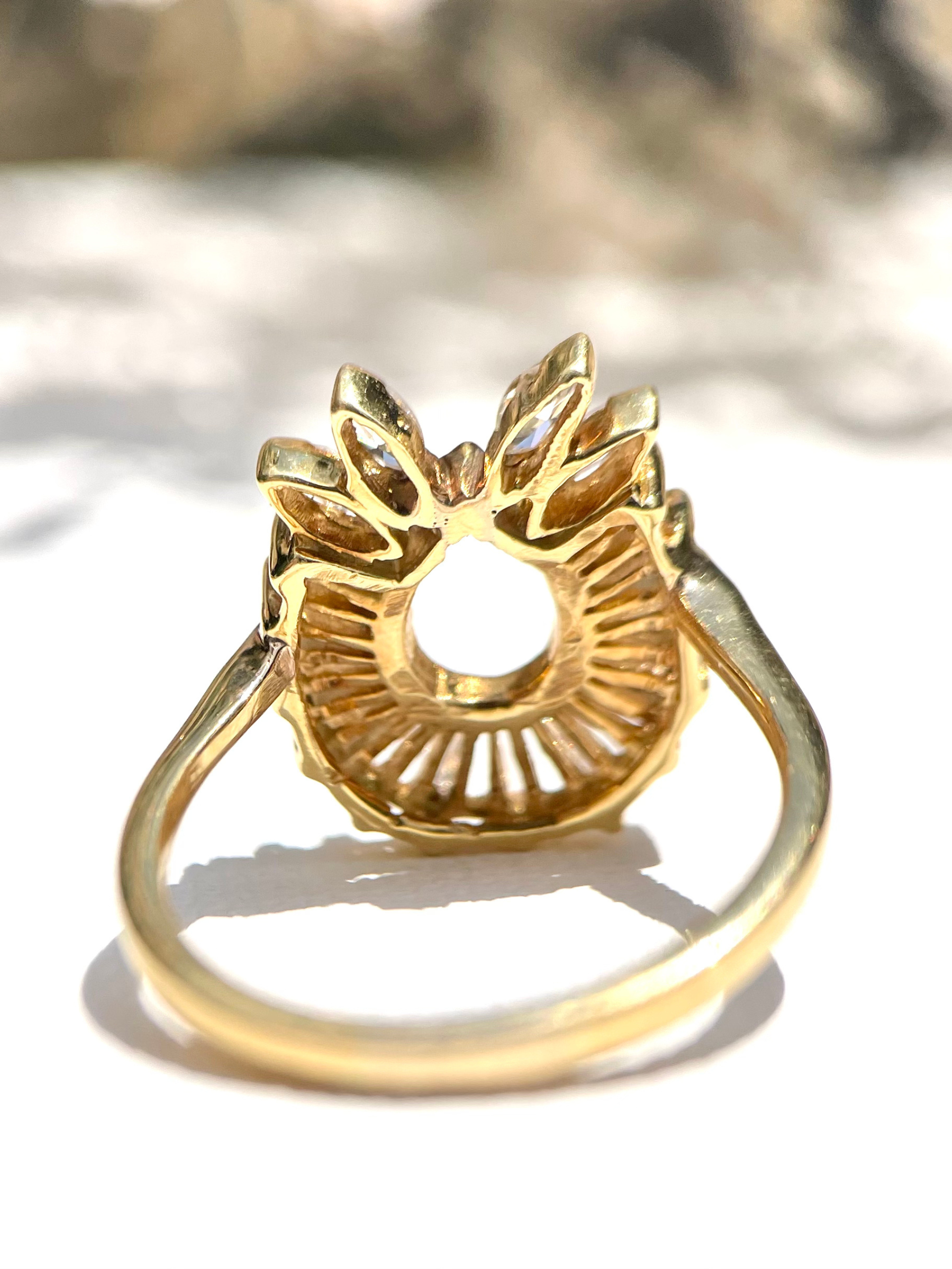 This striking vintage ring is a dazzling celebration of light and form, crafted in warm 14K yellow gold. At its heart is a teardrop-shaped negative space, encircled by an elegant fan of tapered baguette-cut diamonds that radiate outward like sunbeams. Crowning the top are three marquise-cut diamonds, adding a sculptural, leaf-like flourish that enhances the ring’s graceful symmetry.