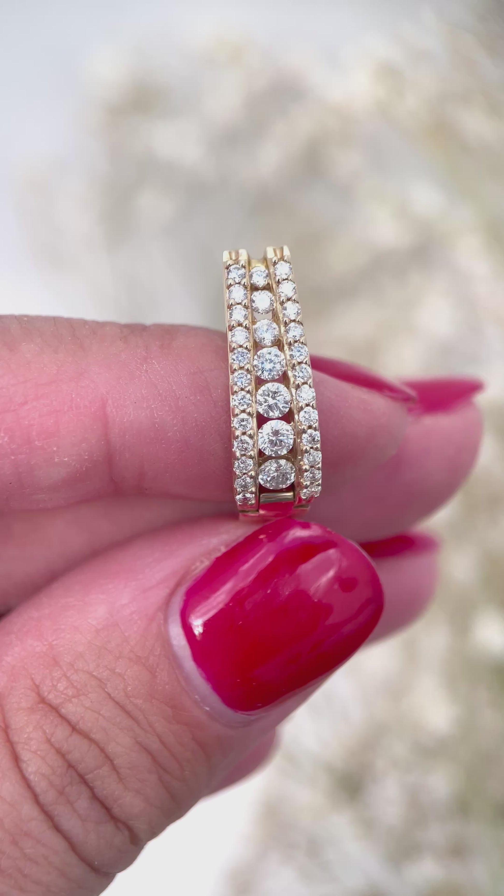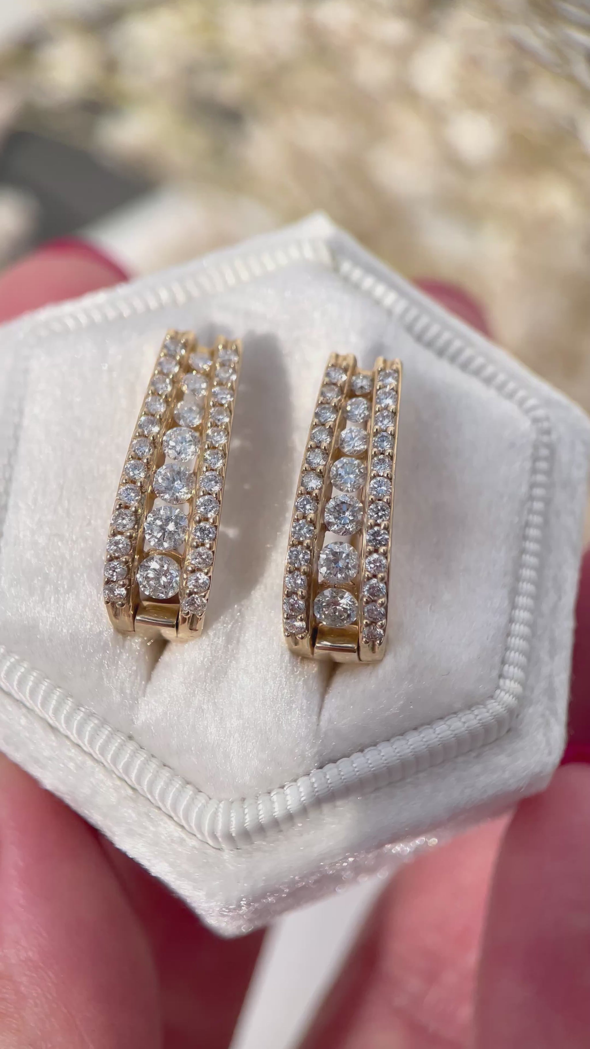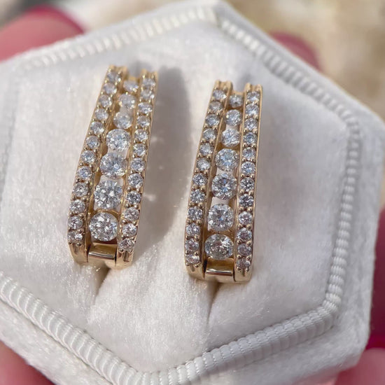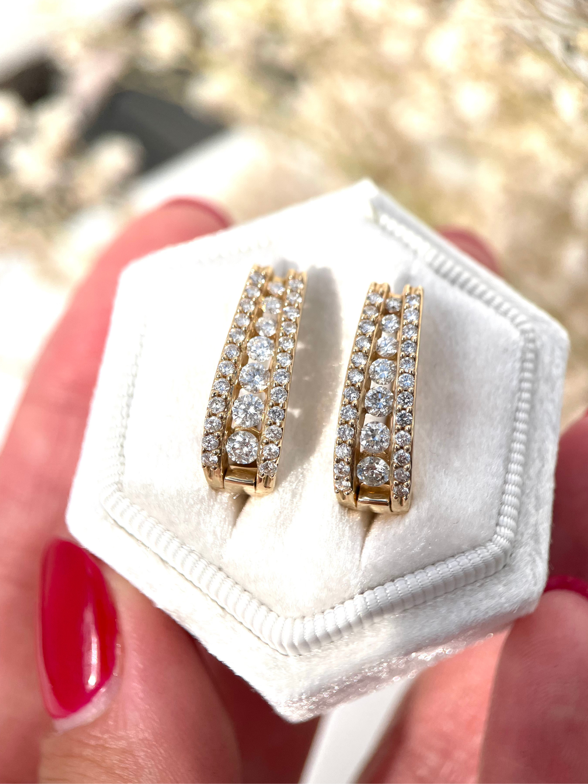 These stunning 14K gold huggie hoop earrings are designed to dazzle with their refined elegance and brilliant sparkle. Each earring features a central row of channel-set round-cut diamonds, flanked by delicate pavé-set diamonds on both sides—creating a layered, multidimensional shimmer. Crafted in solid 14-karat yellow gold, the curved design hugs the ear perfectly and secures comfortably with a hinged snap-lock clasp.