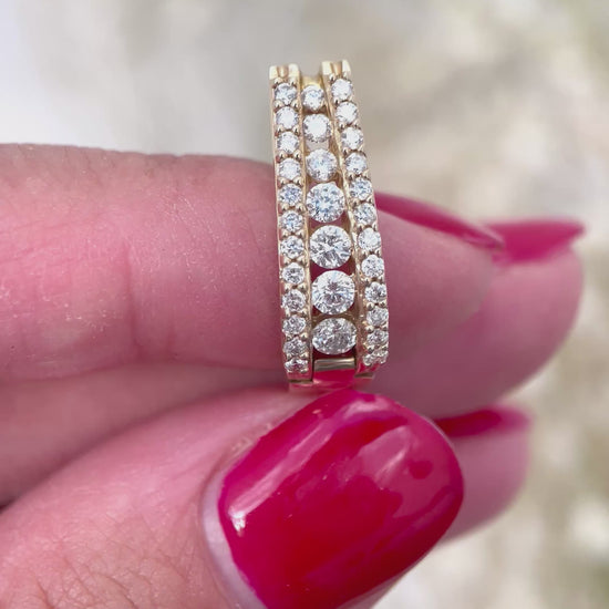 Diamond Huggie Hoop Earrings - 14 K Yellow Gold with Three Rows of Natural Diamonds