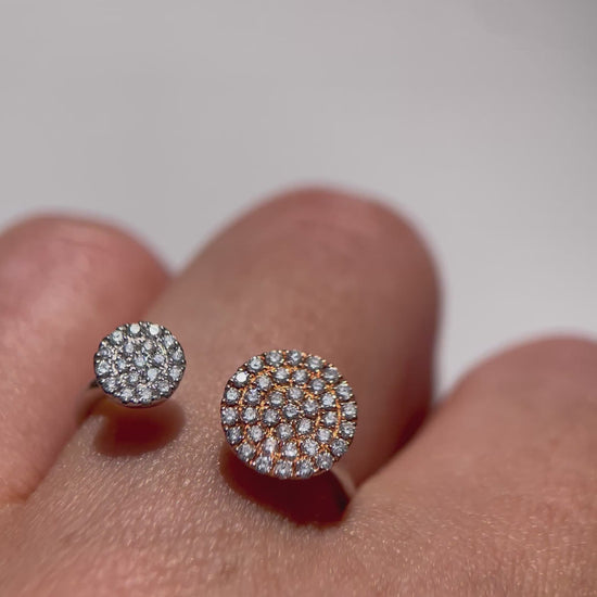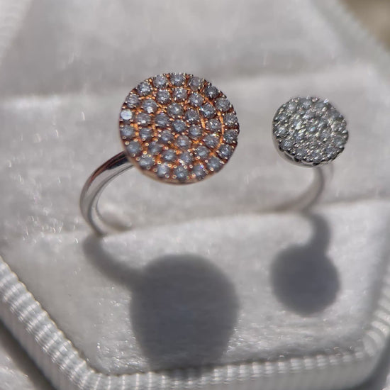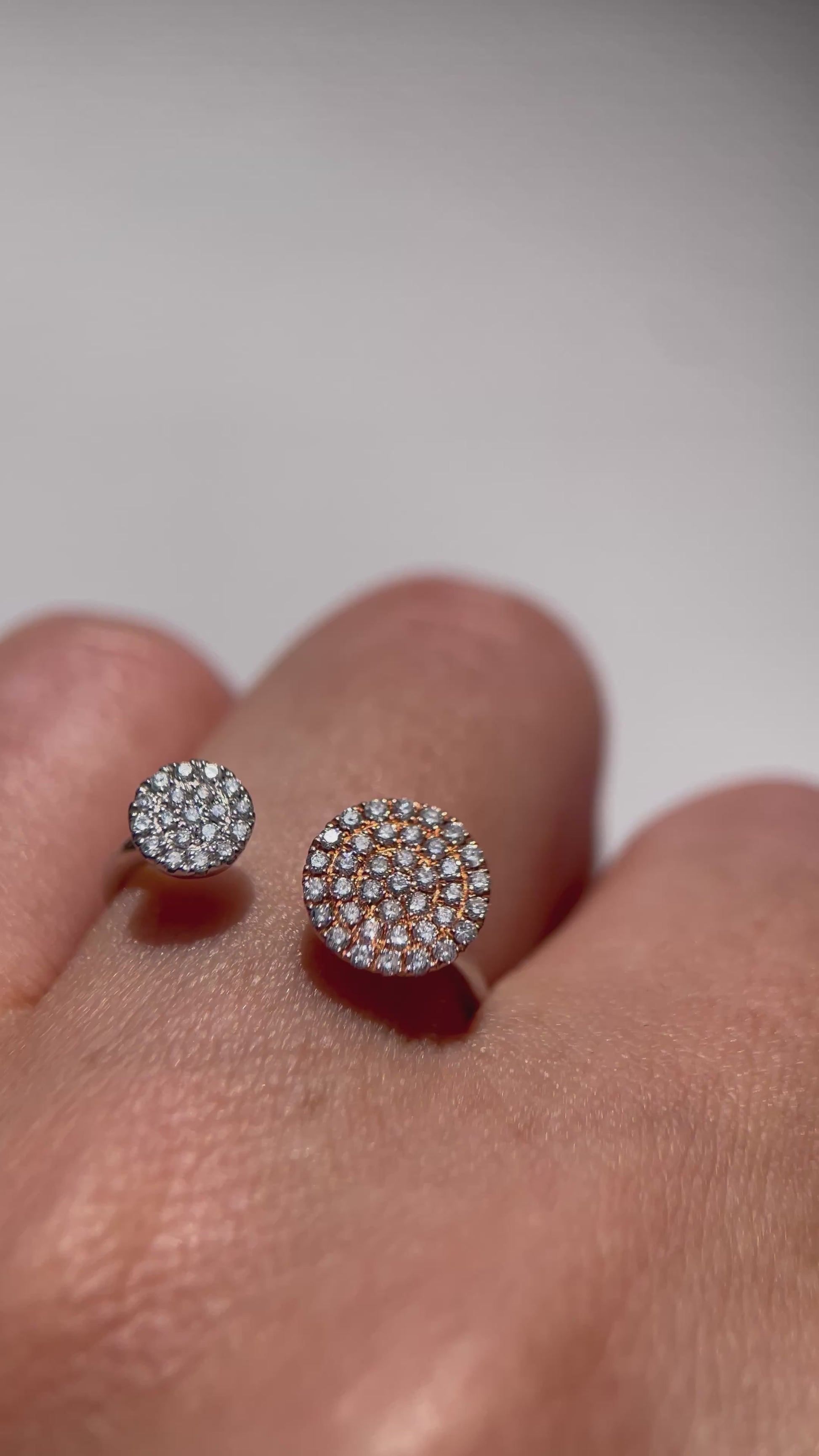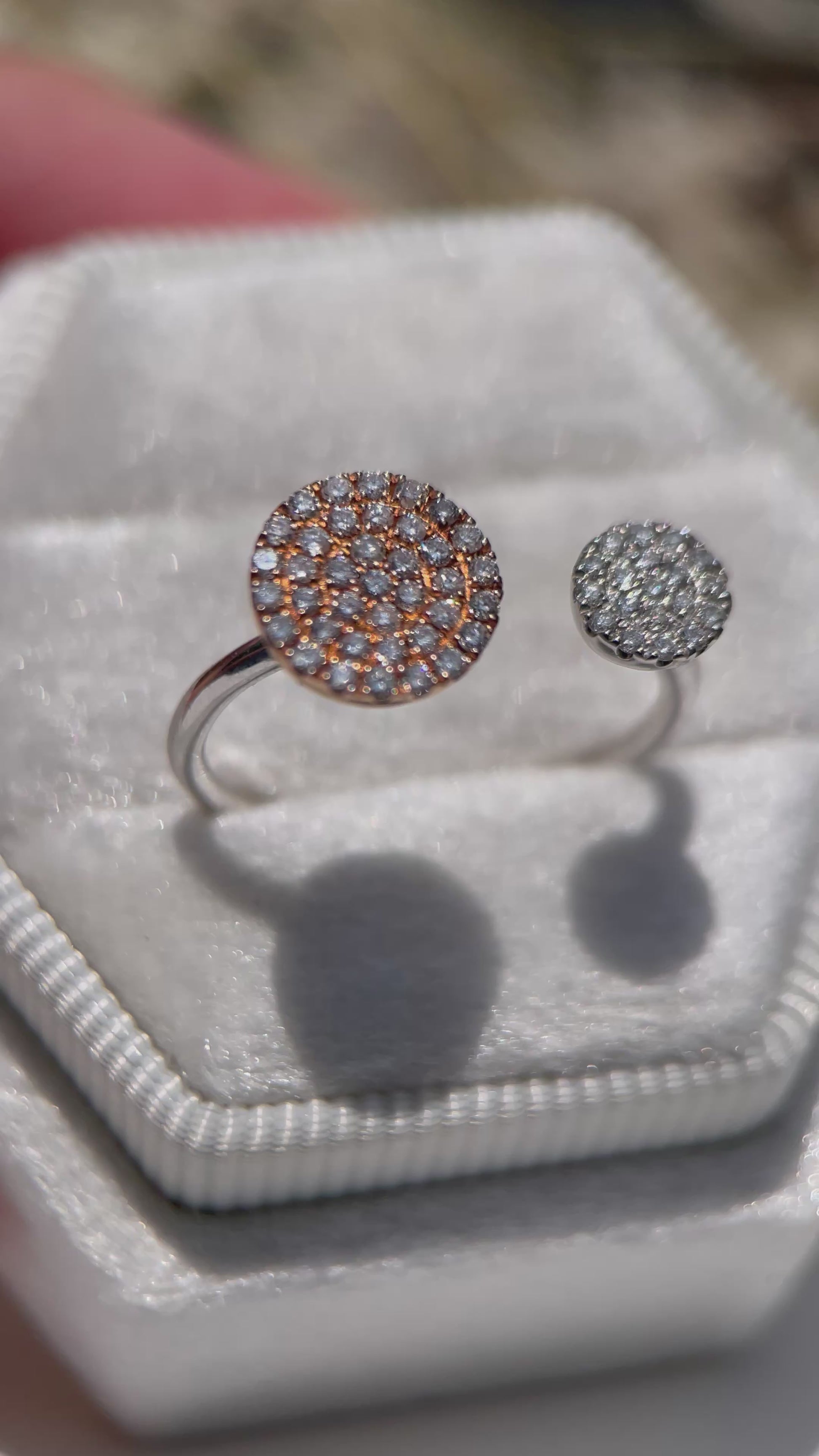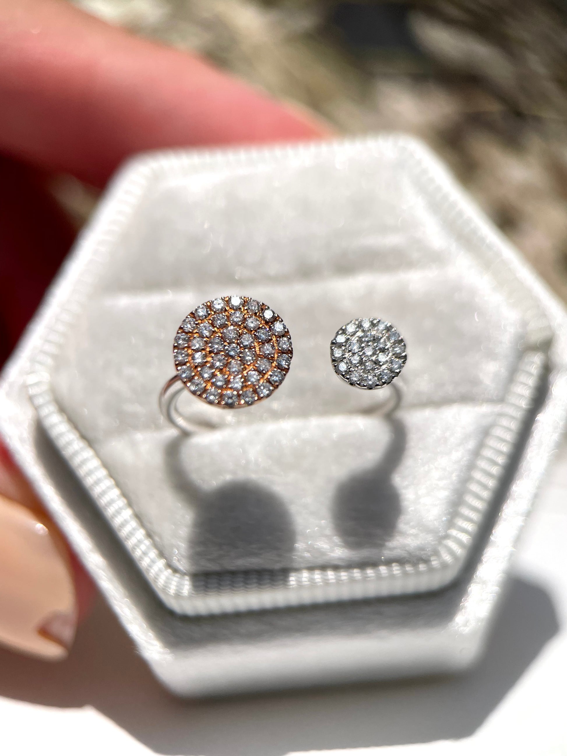 Elevate your fine jewelry collection with this captivating open dome ring, crafted in solid 14K white gold and adorned with natural diamonds totaling 0.30 carats. Designed with modern elegance and symbolic contrast in mind, this piece features two pavé-set domes: a larger circle with warm champagne-tone natural diamonds, and a smaller one set with icy white diamonds—each shimmering with exquisite brilliance.