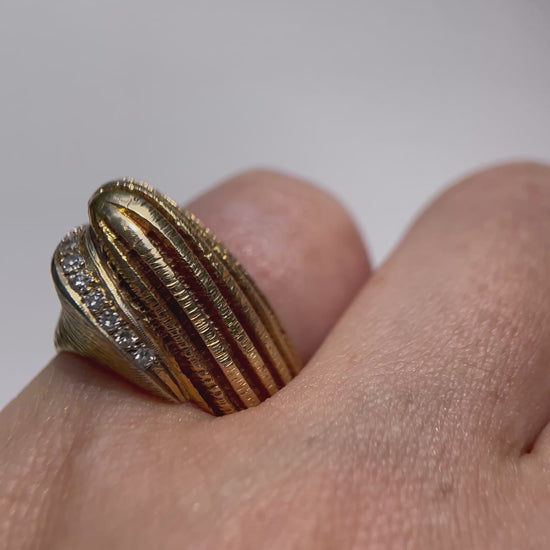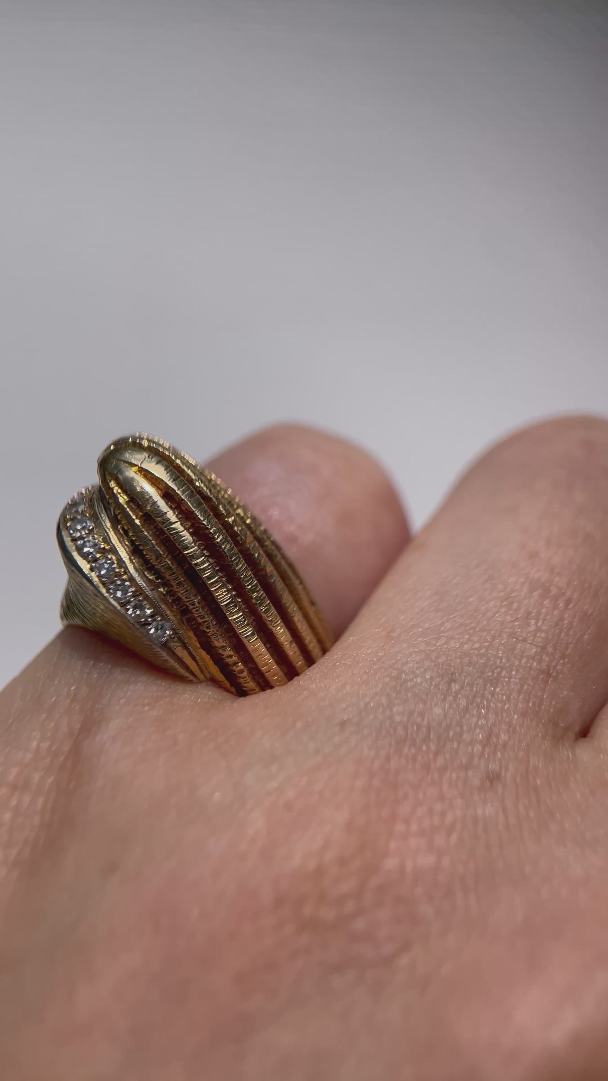This sculptural vintage ring is a true work of art, evoking the elegance of mid-century design with a bold, modern edge. Crafted in rich 14K yellow gold, the ring features a dramatic dome silhouette with hand-engraved, textured grooves that sweep across the surface in a mesmerizing swirl. These dimensional ridges create movement and depth, catching the light with every gesture.